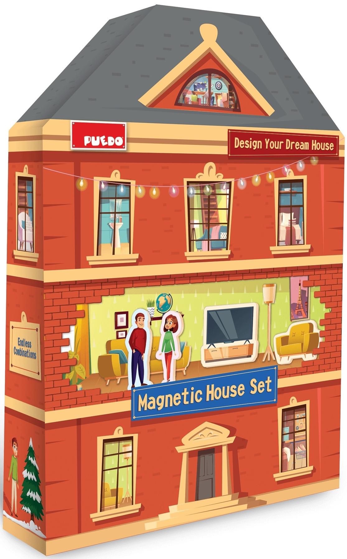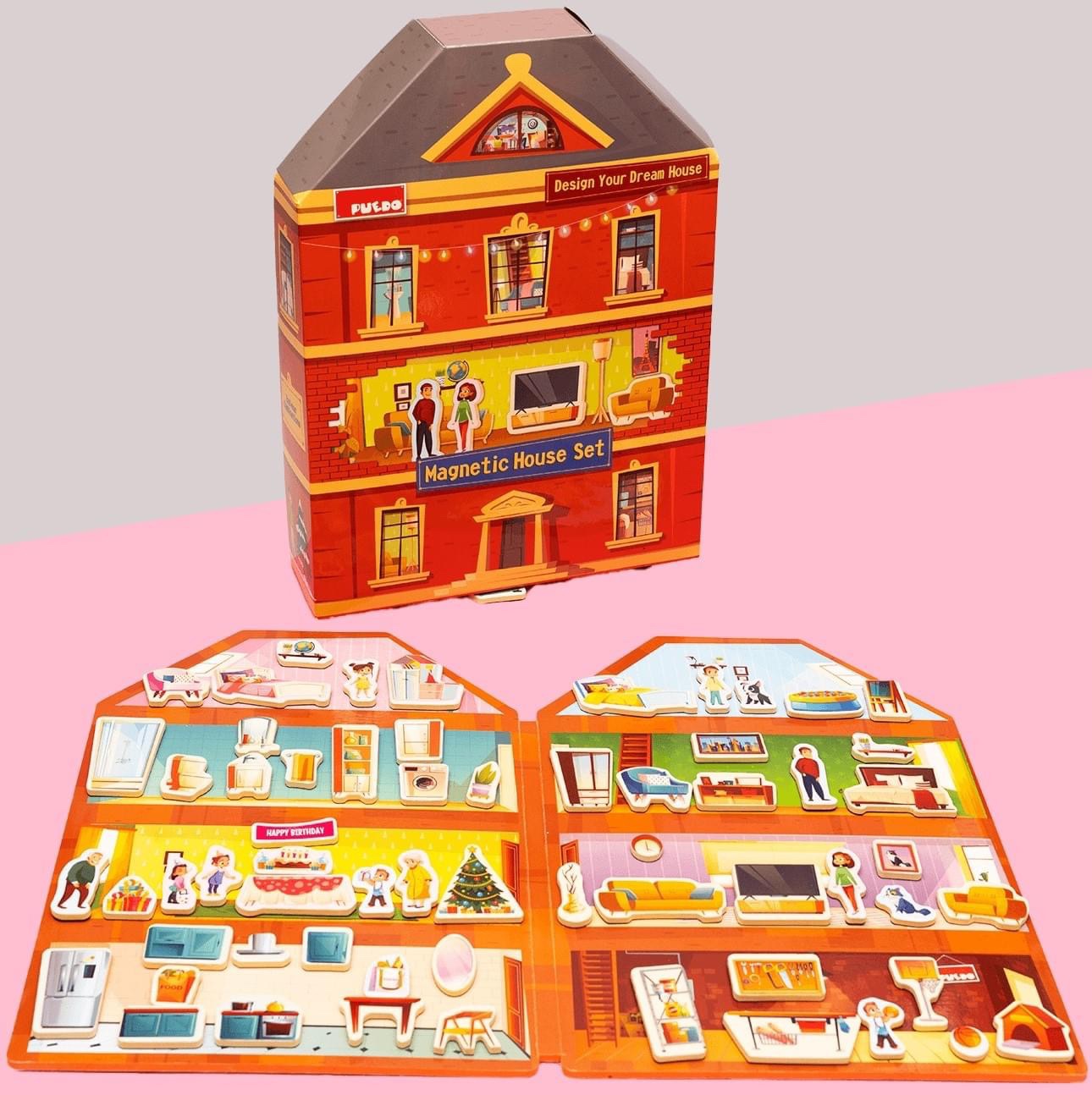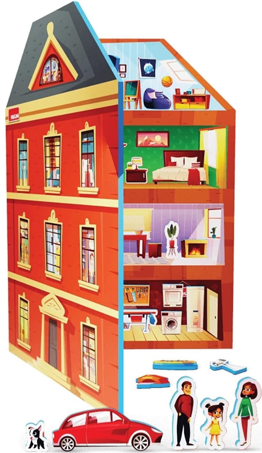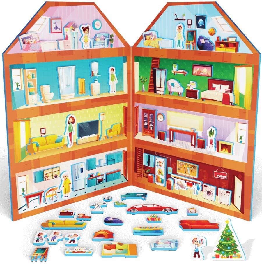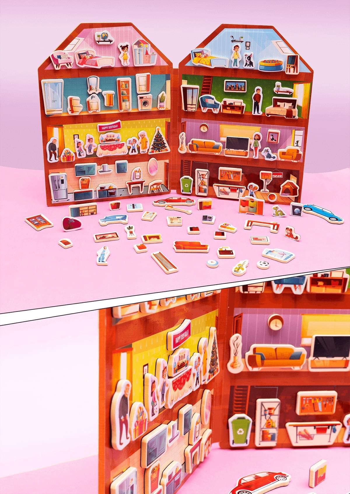 The magnetic house is specially designed as a book format made of foam and 100 different furniture items and household appliances. Each object contains a magnet coated with 4mm thick foam for delicate hands.