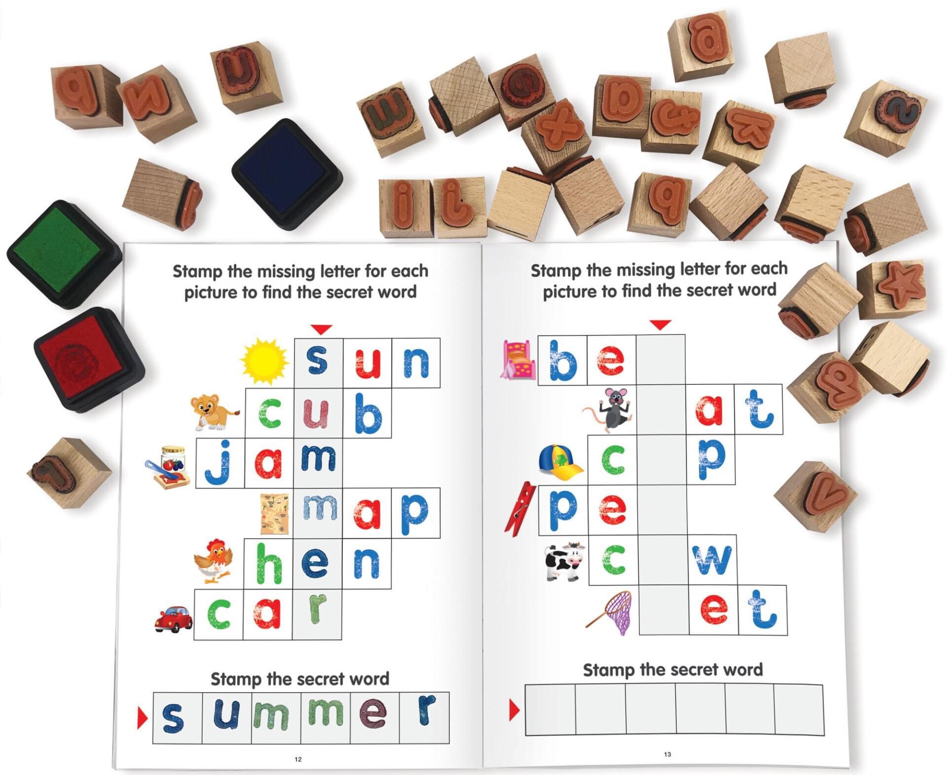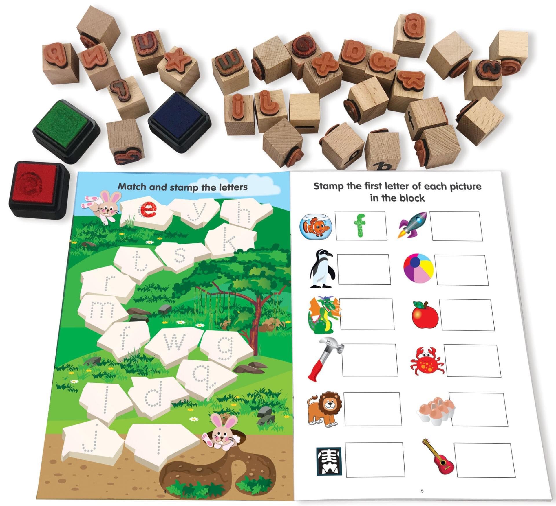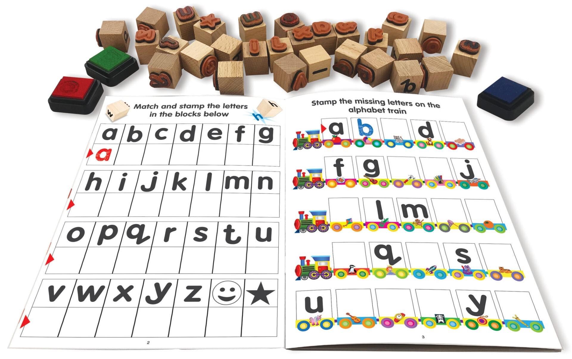 Our Alphabet Stamp set contains 28 sturdy wooden-handled rubber stamps, 3 colour ink pads and a 16-page activity book. Children love being creative and stamping activities are always popular – now they can learn the basics of the alphabet while playing!