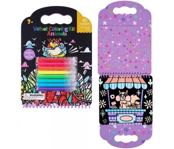 This kit comes with 8 coloured markers and 6 pages of flocked art to colour in and is all contained in a neat flip folder with easy carry handles for when you are on the go. Â This velvet art kit has 6 beautiful illustrations of animals to colour on each page.