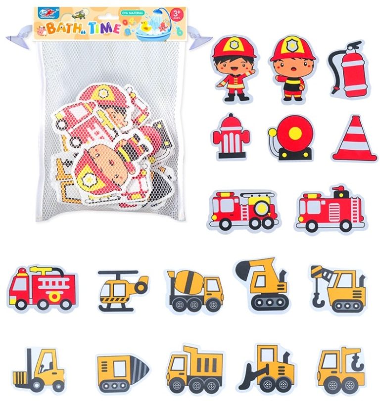 The brightly coloured fire and construction themed pieces stick to bathroom tiles and each other when wet. Loads of calm, relaxing fun! Let’s have a splashin’ good time!