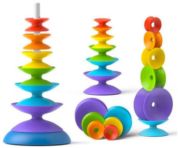 This tower stands almost 40cm tall: Spin, balance, roll, stack or arrange them in any way you want. Pull the pole from the base to watch all the discs tumble to the ground. Then stand and spin (again and again), the best EVER baby spinning toy! Only R230 (valued at R295).