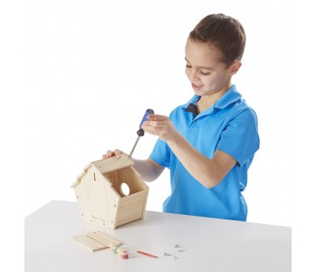 Melissa and Doug Build Your Own Wooden Birdhouse is an easy to assemble birdhouse for children to make with supervision from an adult. Just screw together the wooden pieces decorate with the natural colours of paint that come included and then find a good home for it to be placed. This wonderful Birdhouse comes included with wooden panels screws 4 pots of paint in natural colours and a brush. Already has a pre-printed leaf pattern on the front of the wooden box.