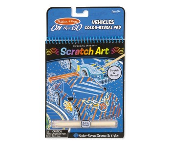 All-inclusive and self-storing, this compact colour-reveal Scratch Art book brings the fun anywhere kids may go. With the included wooden stylus, children can etch within the lines to reveal 12 vehicle scenes featuring cars, trucks, trains, and more; by adding patterns and details, they can make each picture uniquely their own! Each set comes with built-in storage for the included stylus.
