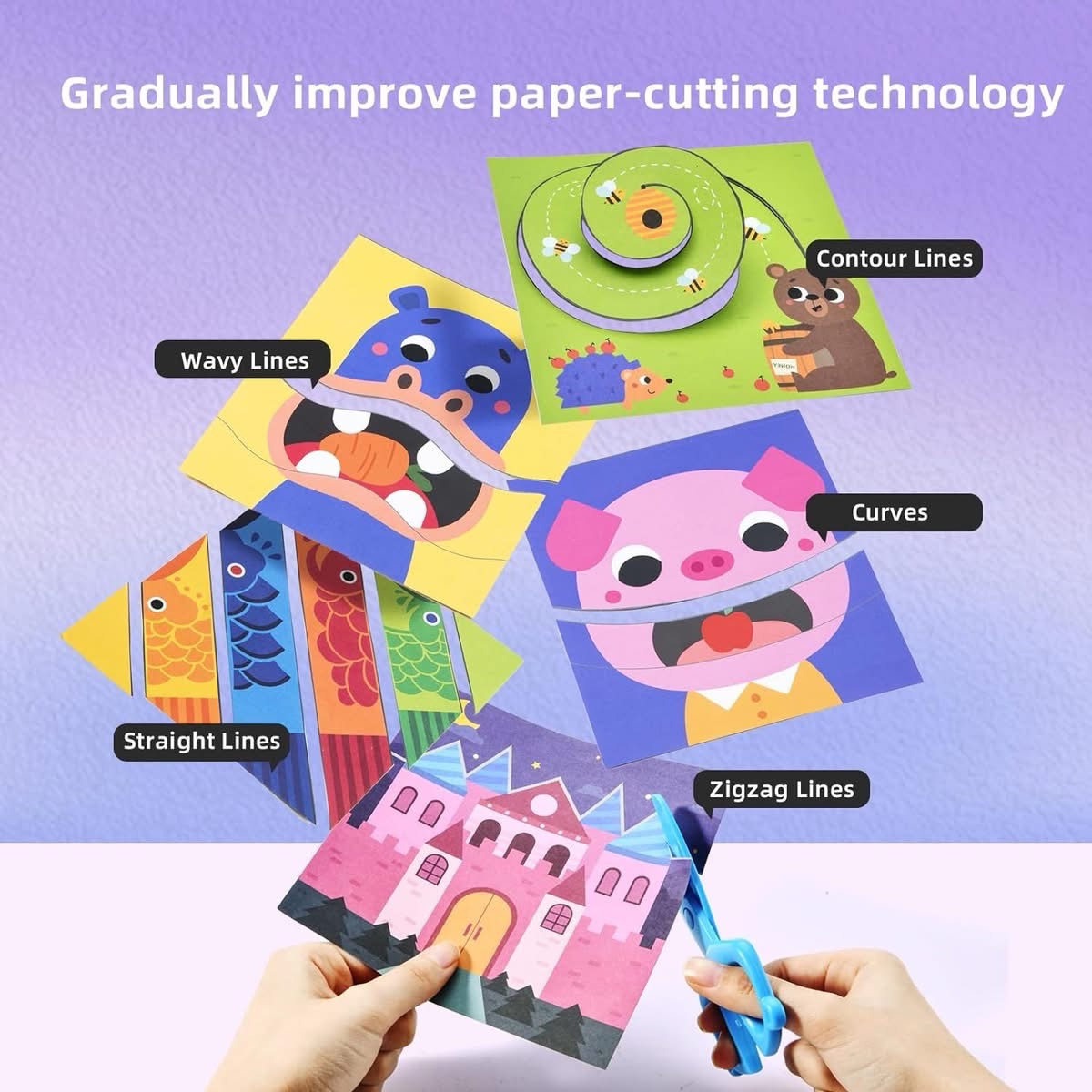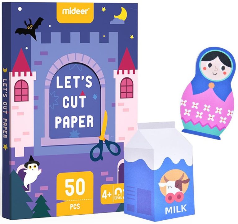 Learning to use a pair of scissors safely is important for school and other activities and your child will love developing this skill this product. This kit is a perfect start to cutting for children. Children will learn how to hold and control a pair of scissors and will advance from simple one-stroke cuts to complicated and curvy shapes.