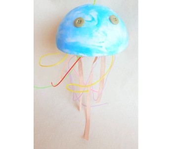 We’re SO impressed with our jellyfish’s beautiful bright colour – and those showy ribbons and buttons just finish this sea creature perfectly. Children use their fingerprints in the small stamp pad to do their painting (GREAT for fine motor skills).