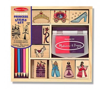 When your little princess is ready to have a ball, she will love designing her own royal adventures with this exquisitely detailed stamp set . A two-colour stamp pad, five coloured pencils and 9 fabulously regal stamps are all packed in a sturdy wooden tray.