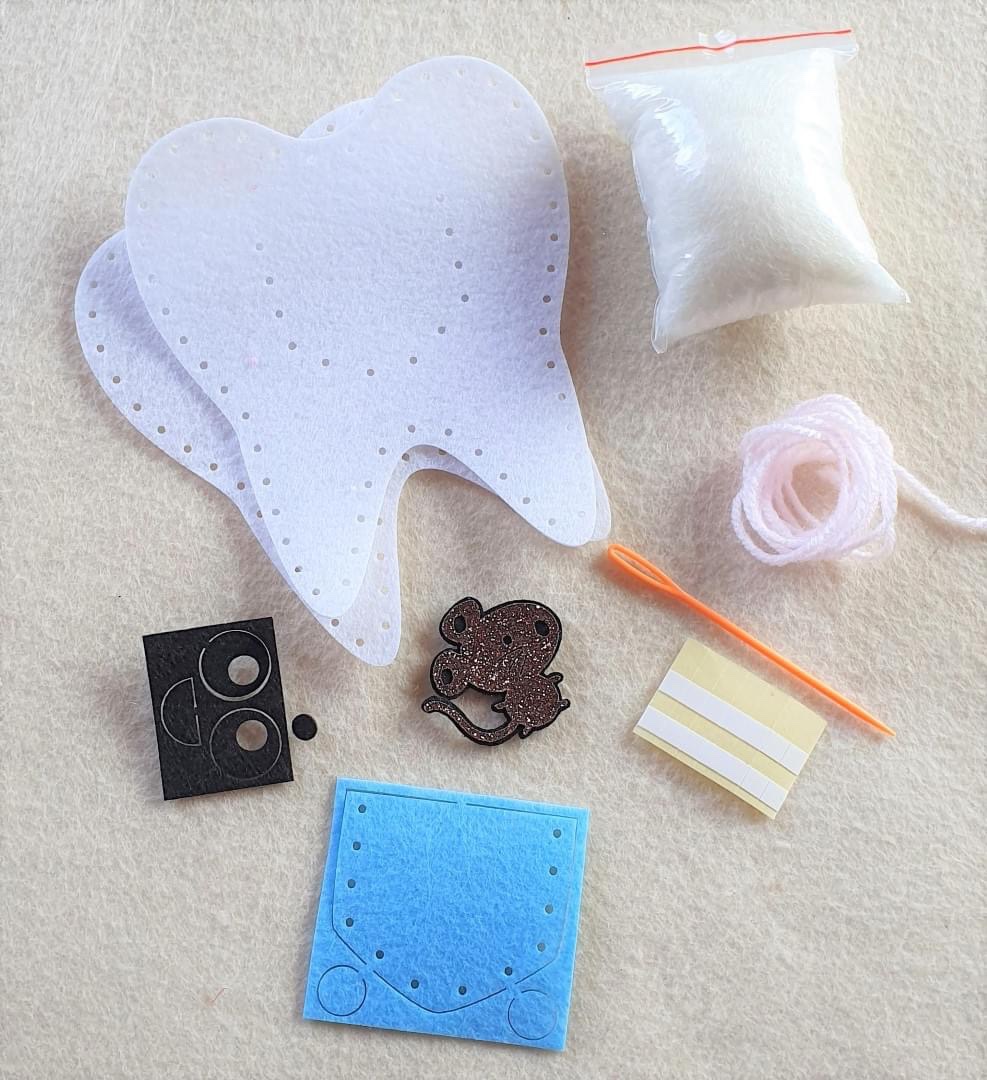 Before the excitement begins parents can help children to create their own ‘tooth mouse pillow to store their tooth. Take all the neatly pre-cut pieces of this kit to stitch together (with the wool provided). Of course, the kit also arrives with a little bag of ‘stuffing’ to fatten up that tooth pillow.