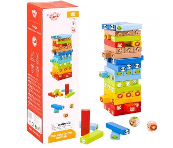 Contains 48 wooden blocks which you build into a tower by layering them 3 by 3. You then take turns removing blocks one by one trying not to let the tower tumble. The blocks in this beautiful set have little animals painted onto the ends. This not only looks pretty but allows you to roll the dice and then remove the animal that you rolled on the dice. This adds another educational dimension to this game as you look at the dice and then match the animal.