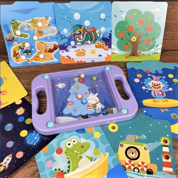 Choose your favourite, slide it into the board then roll the balls into the grooves one by one. The board has easy to hold handles on the sides, balls are safely ‘trapped’ behind the perspex cover (so no lost pieces mom) 😊