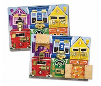 Undo a lock or latch, swing open the numbered door and count on finding fun when the picture beneath is revealed on this wooden play board and educational toy! Build fine motor skills while learning colours, numbers, animals and more!