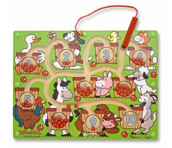One for the goose and ten for the goat…in the Magnetic Wand Number Maze, the animals are counting on you! Fill each basket with the correct number of red “apples” by sliding the attached magnetic wand over the acrylic cover . Then move the apples to different areas of the maze game to add, subtract, and make child’s play out of maths! The magnetic wand is attached so it won’t get lost; all other pieces are enclosed inside the maze, beneath the sturdy cover. Great for travel!