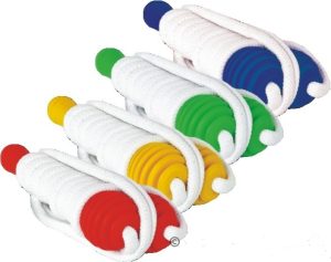 Our skipping ropes have brightly coloured plastic handles which clip together for easy storage when not in use.  There is a removable section on the tip of each handle – if the rope is too long, remove the tip and adjust the rope to the required length.  Tie a not at the end of the rope and replace the tip.