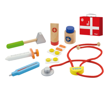 Medical kit – a convenient doctor’s case with metal handle and clasp. It includes everything needed for your little doctor to enjoy hours of fun. Includes stethoscope, capsules, tablets, thermometer,syringe, medicine bottle, cream bottle and hammer. Each detailed wooden piece has been hand crafted and painted to look very realistic.