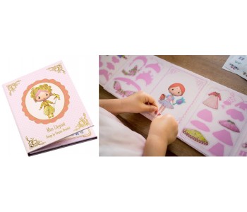 The little notebook opens to reveal the doll to be dressed. 4 wardrobe sheets with specific shapes to store clothes, shoes and accessories by sticking them on.