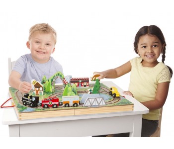 Built-in tracks, colourful scenery, and fun play pieces let kids take their imaginations for a spin . . . and take playtime anywhere they want to go! Unfold the sturdy wooden case to create an illustrated play surface with built-in train and road tracks for the three wooden wheeled trains and a park ranger vehicle. Set up a bridge and a mountain tunnel with a gondola that slides across the top!