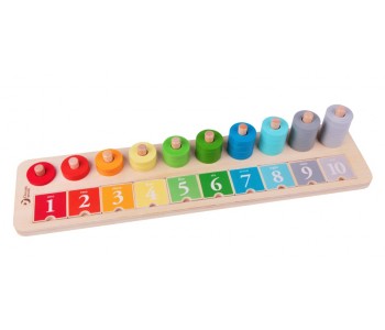 Ten wooden tiles with numbers 1 -10 and ten wooden tiles with dots representing the numbers 1-10. Also pegs with coloured wooden rings that can be counted.