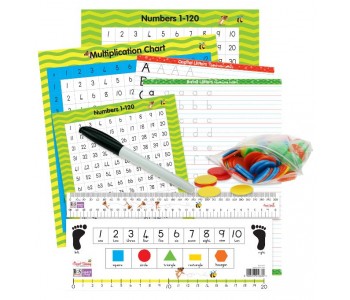 Learn and practice everyday literacy and numeracy skills using the eight laminated double-sided write and wipe boards that are included in the set. Practice letter and number formation (the charts show arrows to enable correct formation). Learn all about basic shapes, colours, numbers, name writing and reinforce writing skills from left to right.